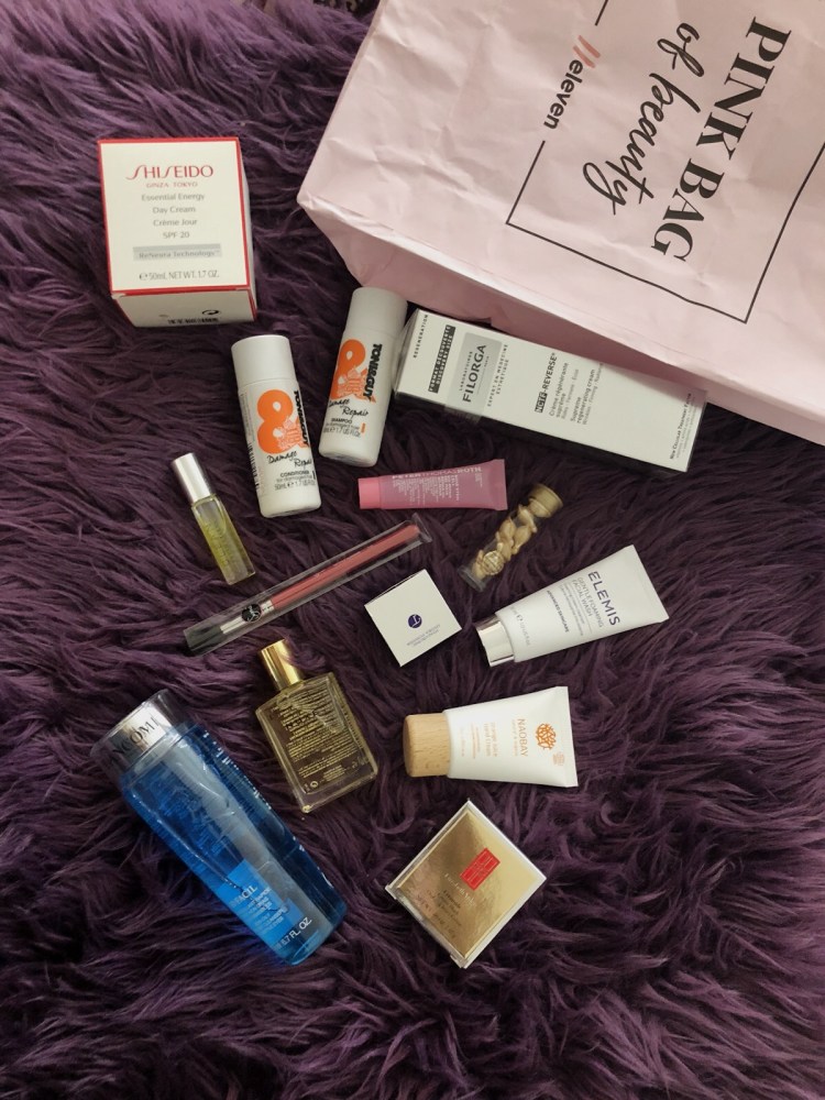 I bought a day cream by Shiseido, a make up remover by Lancome and a cream blush by Elizabeth Arden and I got 20% discount on my total purchase and then got this beautiful pink beauty bag with full of beauty items!