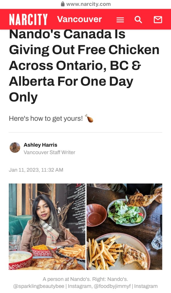 The most amazing thing is that famous Narcity Canada featured one of my Instagram picture in their article. This picture is when I visited my favourite Nandos & it caught Narcity’s eye.